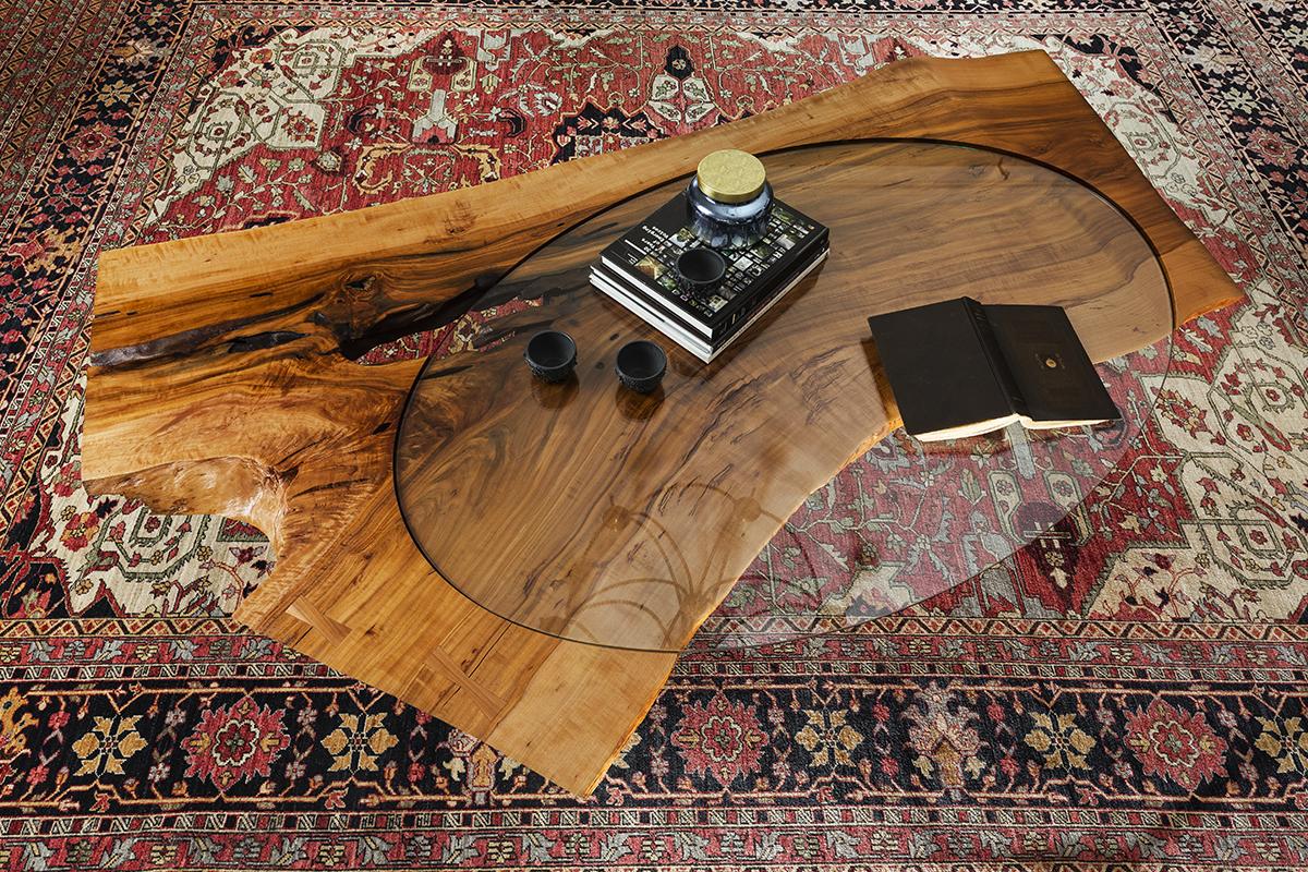 Live edge coffee table with geometric dished glass, a beautiful pairing of rugged organic and geometric forms. Available for custom order in a wide variety of shapes, sizes and wood choices.