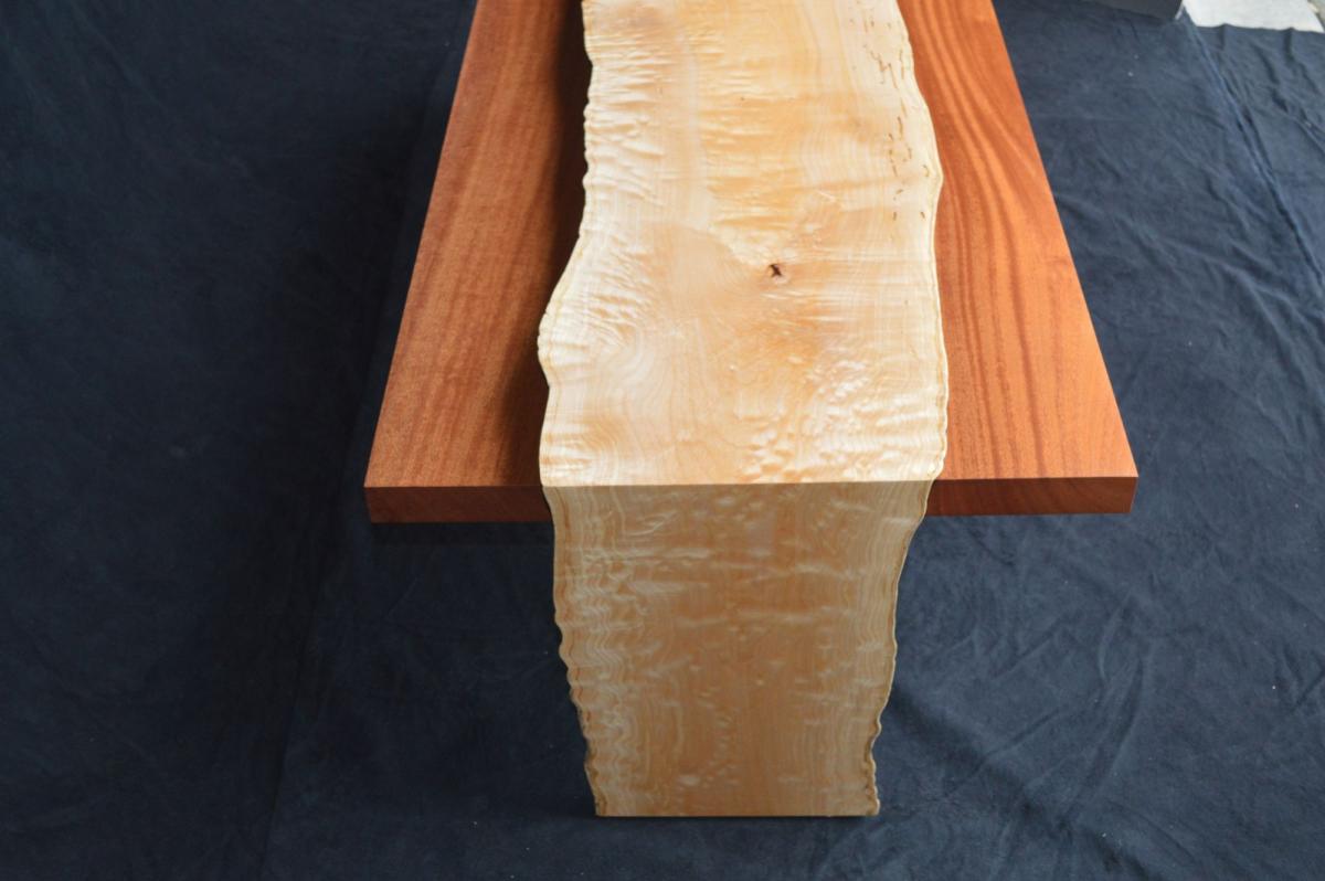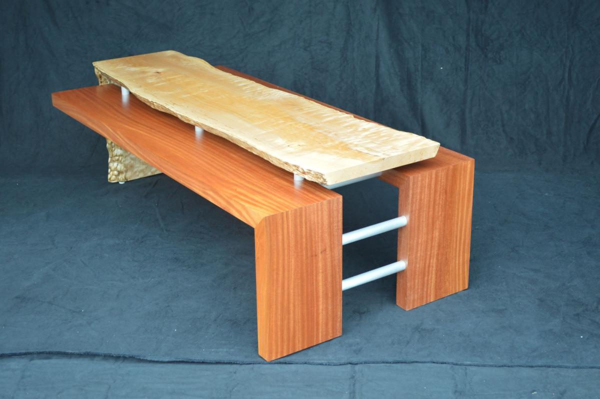 A bi-level coffee table in dazzleing quilted maple and khaya mahogany. Accented by brushed aluminum.